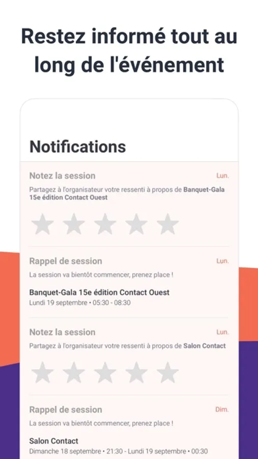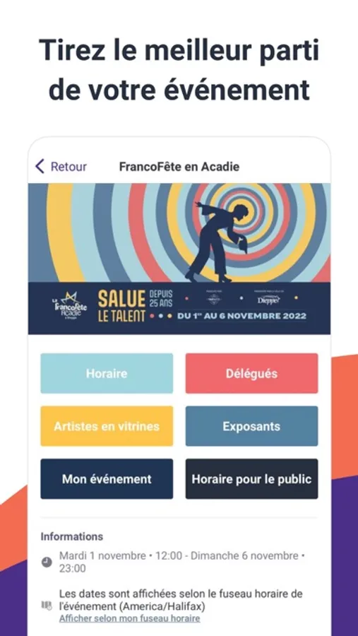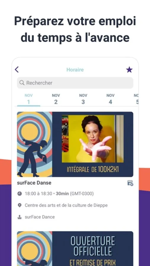 Suivant l’évènement auquel vous êtes inscrit, accédez aux horaires complets, aux fiches des artistes en vitrines, aux contacts des délégués nationaux et internationaux, ainsi que beaucoup d’autres fonctionnalités.
