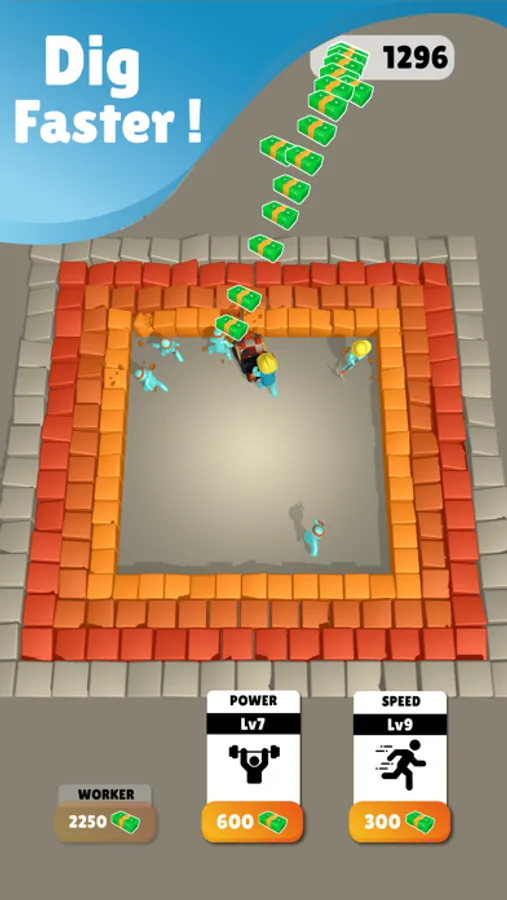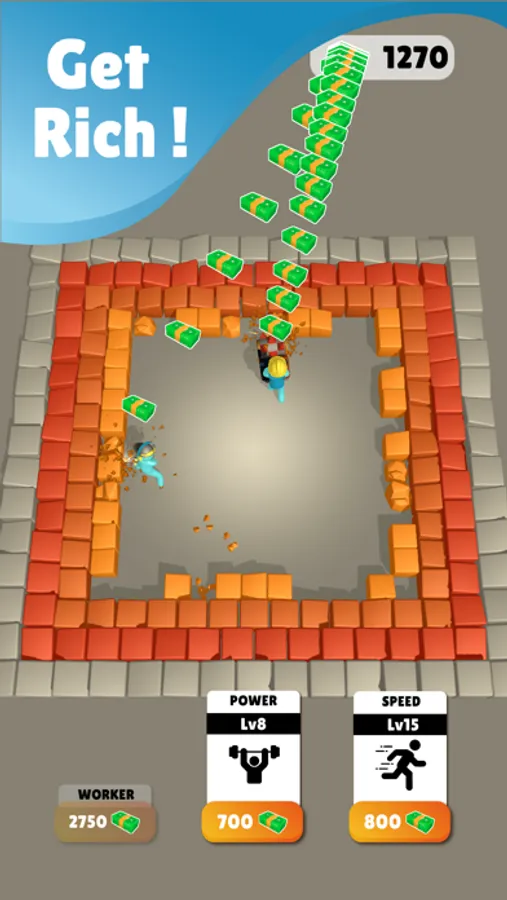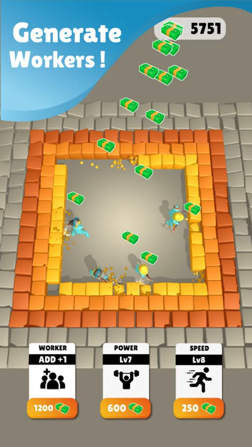 Earn Money, hire workers, upgrade workers and merge, earn more Money and become rich! Don’t forget to click whilte doing them!