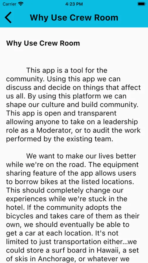 Crew Room allows an organization to manage and discuss issues and find solutions to them. Additionally, it allows organizations to share access to shared equipment, such as a rental bike. Join today!