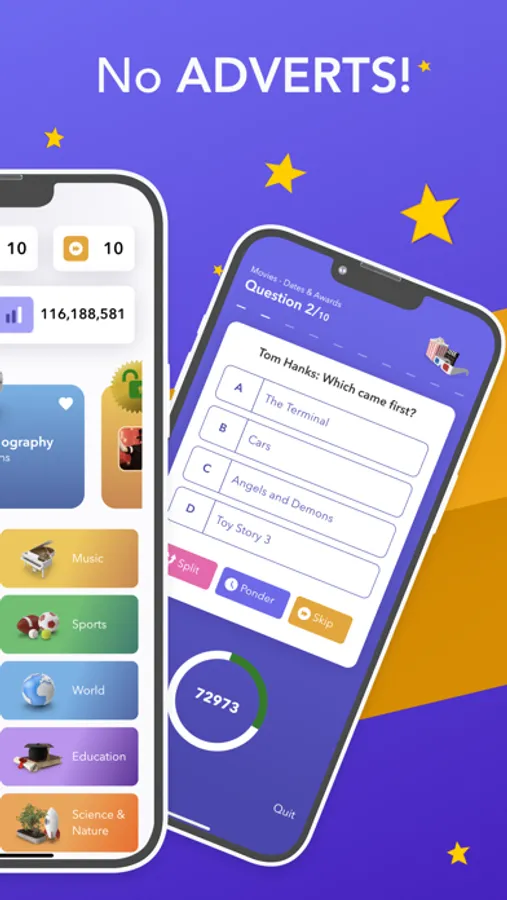 With over 75,000 questions and NO ADVERTS Quiz Stars is the ultimate quiz app.