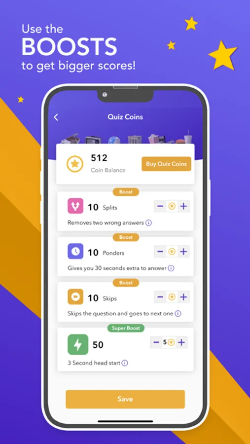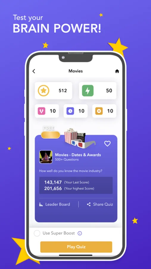 If you want to use SUPER BOOST then you get a 3 second head start for all 10 questions so you can read the question before the answers are revealed and the score and timer counts down