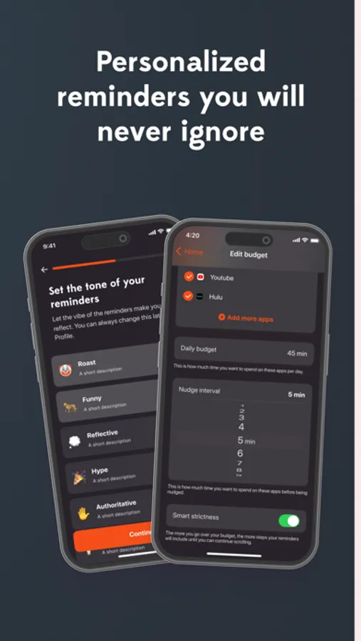 - Choose your hero: What kind of vibe are you going for? Do you want to be roasted by a firm hand? Or maybe you’re looking for something more warm and friendly. You get to choose which tone of voice the reminders will take to motivate you.