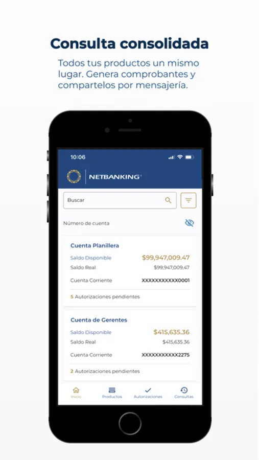 Podrás conocer de forma inmediata la información de tus cuentas y la posición de efectivo de tu Empresa; generar comprobantes de pago y compartir por redes sociales, entre otros.