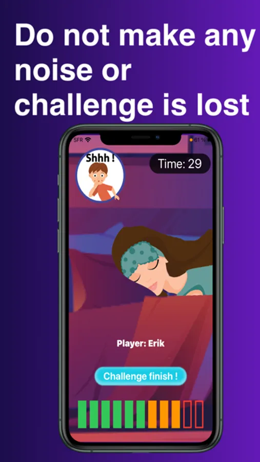 Sneaky Kids is a Game to be played like a board game for 1-4 players. Players take the role of children sneaking to the refrigerator late at night, trying not to wake any family member. Players have to cross different rooms where challenges await them. Challenges are made using some real basic objects that everyone can find in a room. Perform the challenges without making noise, your phone microphone will be checking that and reach the fridge to win the game !