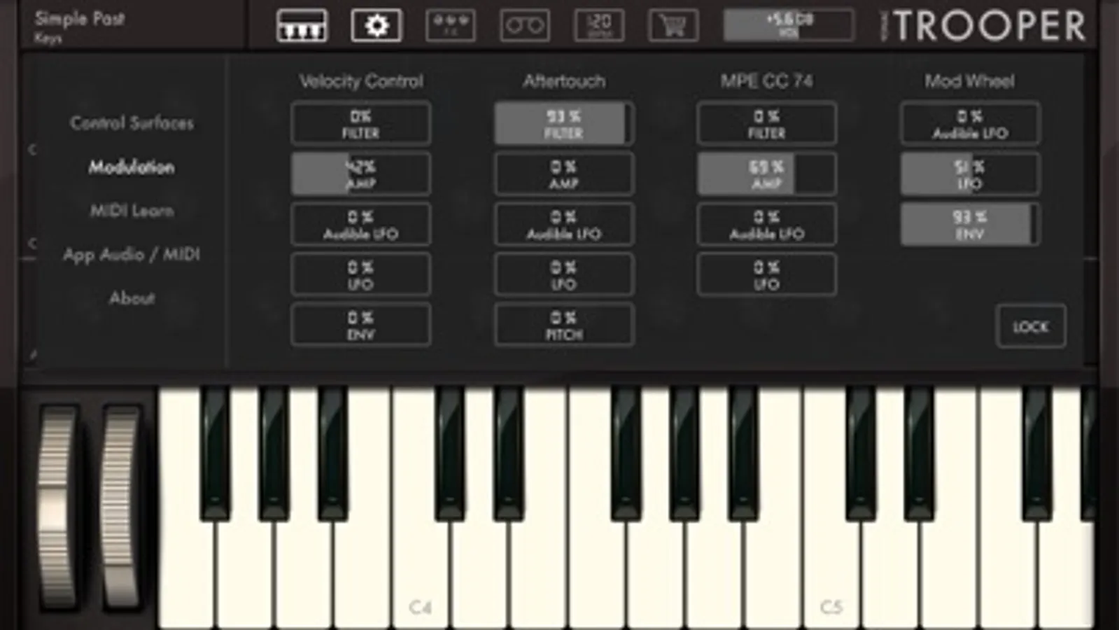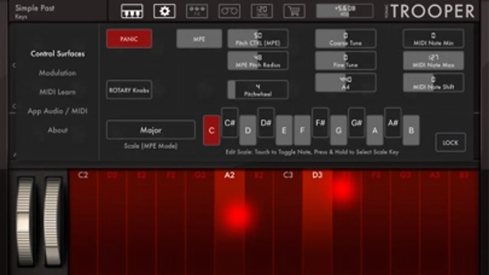 The AUv3 implementation lets you to run multiple instances of Trooper in DAWs. Trooper’s fluid UI accommodates a wide variety of screen sizes and view configurations. Feature navigation is designed to be nonintrusive so that parameters can be accessed easily. The iPad implementation supports portrait layout, so that pretty much all is on one screen.