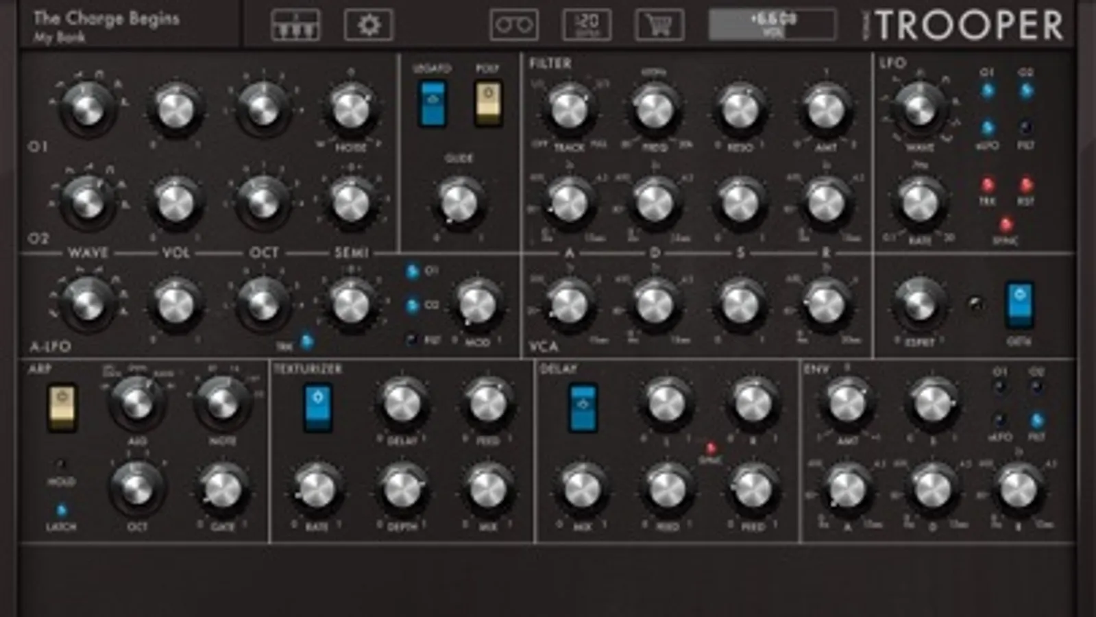 The arpeggiator inspires rhythms with five algorithms, variable note value, octave range, and gate. The “Texturizer" purveys a wide range of modulation effects that include chorus, flanging, variable comb, resonant delay, and stereo imaging. The BPM-syncable two-tap delay has time and feedback controls per channel, and is tuned a little darker than our usual offerings. Trooper can run in monophonic or polyphonic mode, the latter providing up to 12 voices. Legato is available in either mode.