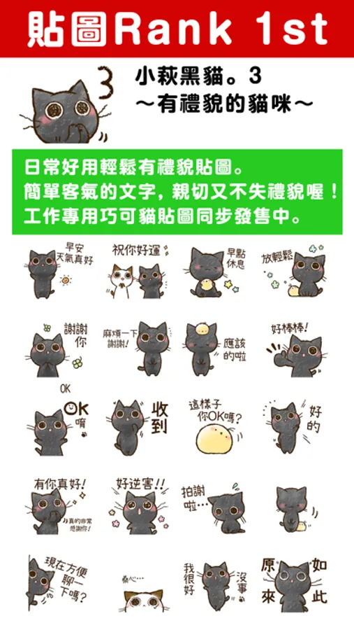 日常好用輕鬆有禮貌貼圖。簡單客氣的文字,親切又不失禮貌喔!工作專用巧可貓貼圖同步發售中。【eri takao製作】