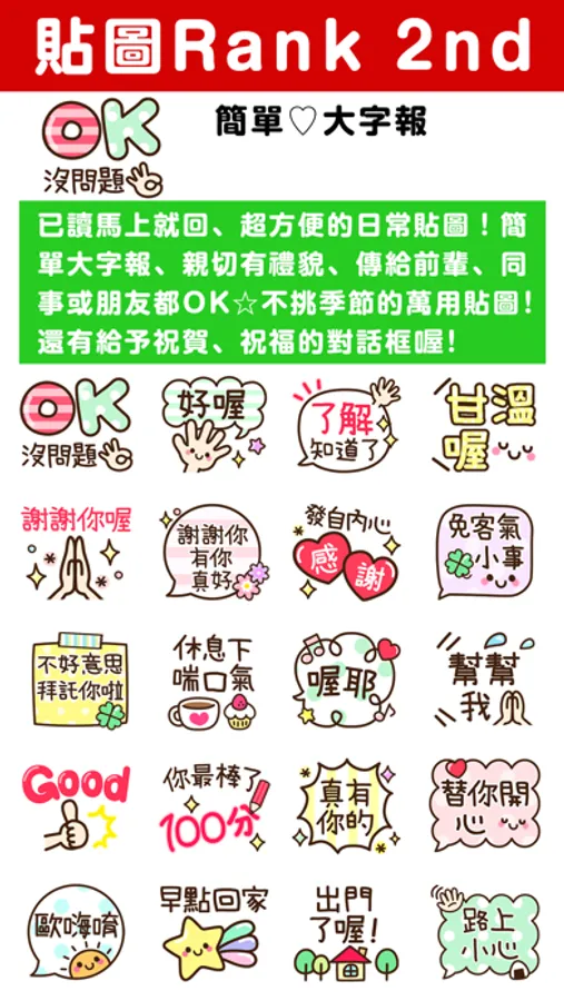 已讀馬上就回,超方便的日常貼圖!簡單大字報,親切有禮貌,傳給前輩、同事或朋友都OK!不挑季節的萬用貼圖!還有給予祝賀、祝福的對話框喔!