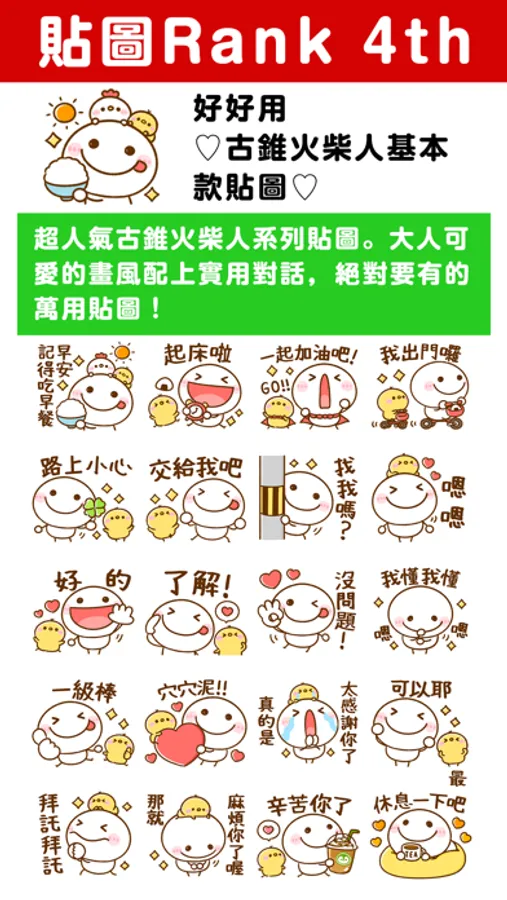 超人氣古錐火柴人系列貼圖。大人可愛的畫風配上實用對話,絕對要有的萬用貼圖!