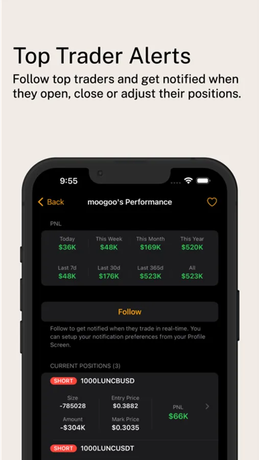 Follow top traders and get notified when they open, close or adjust their positions.