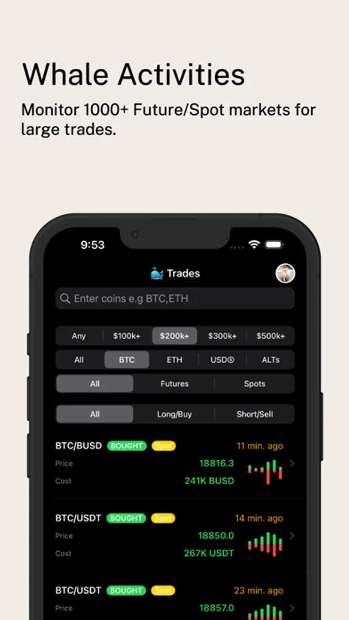 Get alerted of large buys/sells and track whale activities for 1000+ Future & Spot markets.