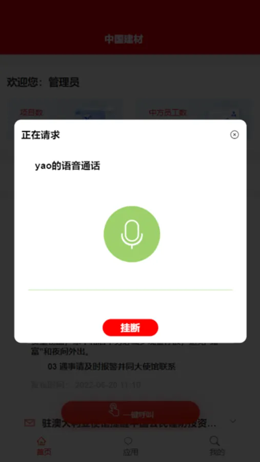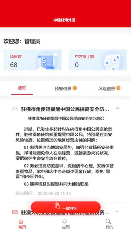 中国建材海外通APP产品是中建材信云智联科技有限公司(以下简称“信云智联”)为了保障用户生命安全,及时发布各个风险国家或者风险地区信息,用于提醒用户关注存在安全风险的地区信息,从而保证用户安全。app主要功能包括一键呼叫,风险地区信息查询,相关项目信息查询等功能。该APP面向所有终端用户使用,均可以注册登录该app关注风险信息,紧急情况时可以发送求救呼叫等