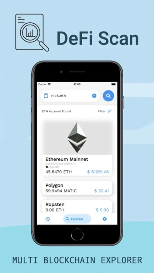 With the DeFi Scan app, you can search, explore, curate & store records of multiple cryptocurrency accounts in one overview. Without logging in or creating an account, you can check the balance, transactions, and tokens of any address.