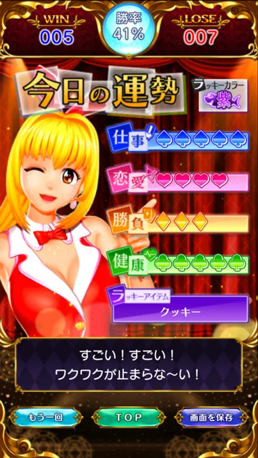 ぱちんこ大海物語5に搭載されている「LUCKYジャンケン占い」がアプリになりました。マリンちゃんとジャンケンして、その勝敗によりあなたの今日の運勢を占います。毎日の日課に、ぱちんこ勝負前の運試しに、ぜひお楽しみください!