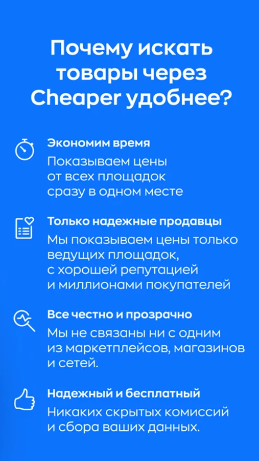 If you have any ideas on how to make the app more convenient or improve search, please contact us at cheaper@cheaper.ru