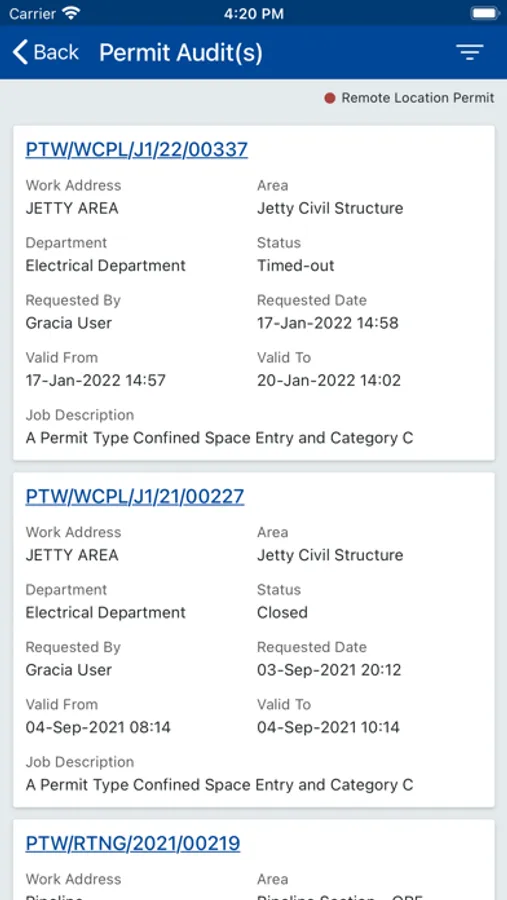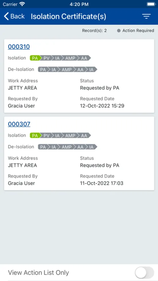 - The appropriate authority gets a visual progress bar indicating for a particular Permit/Isolation Certificate/Confined Space Certificate.