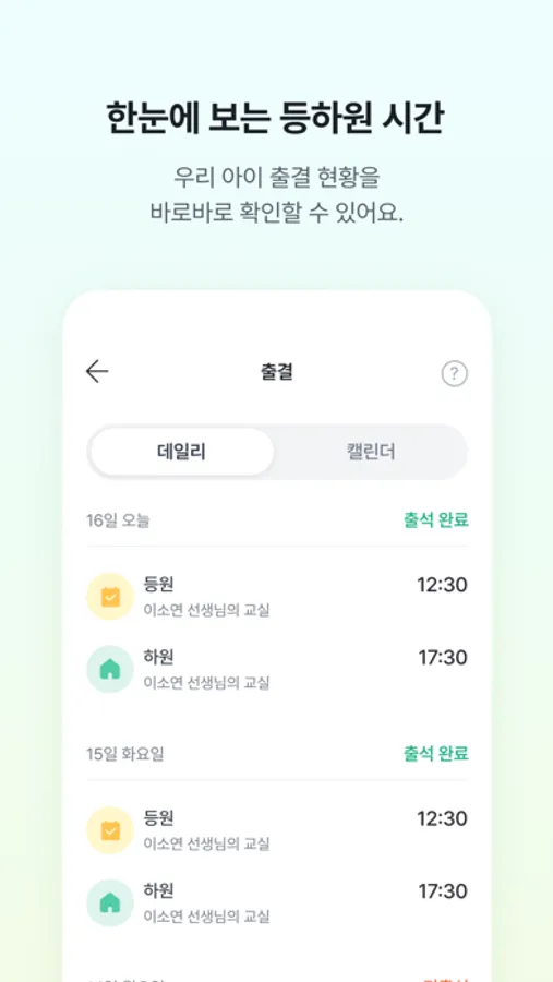 - 등하원 시간 실시간 알림(푸시메시지)으로 출결 확인