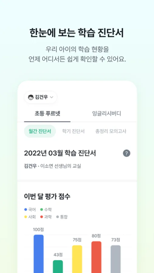 - 아이의 과목별 성적 및 성적 추이 확인