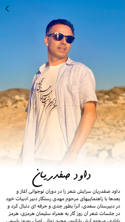 Davoud Safdarian is coming from new generation of Persian poets; here you can find and download the application of all his up-to-date poems / books in Persian and translations in English language; the books are included with couplets (do-bayti) and sonnets (ghazal) officially published and distributed.