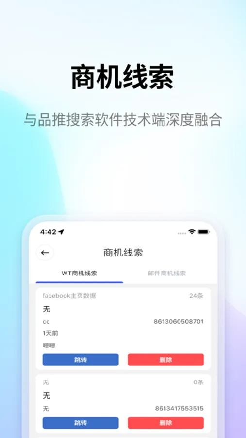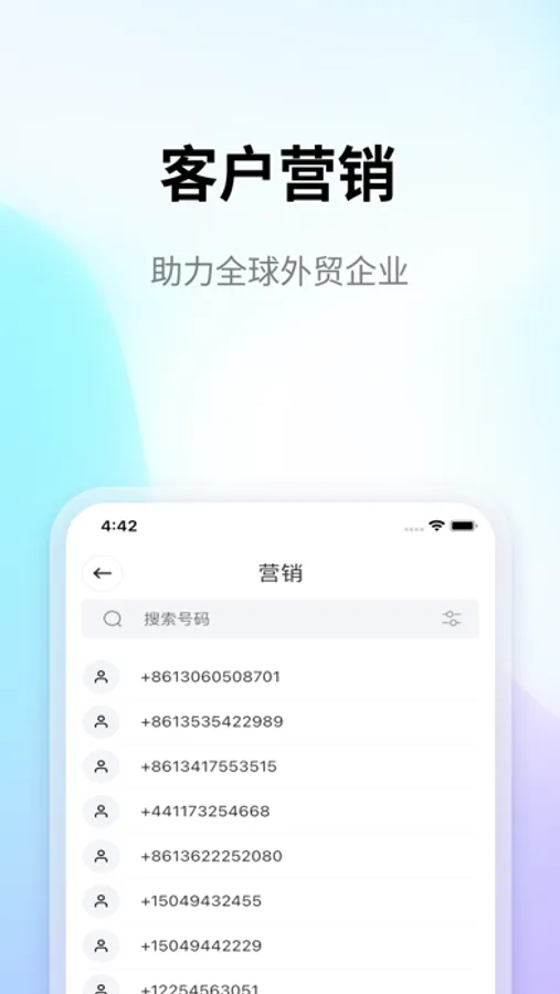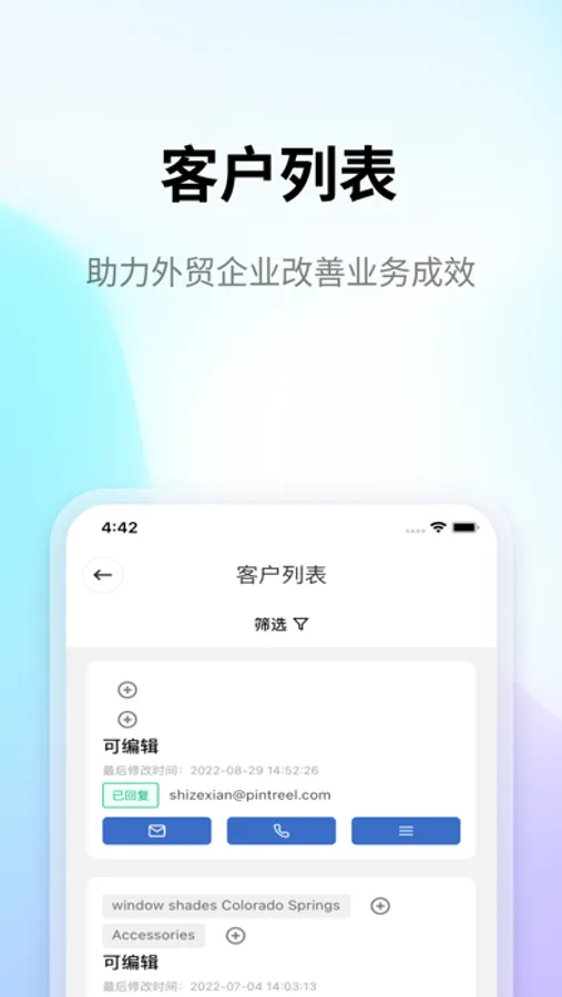 品商CRM是面向外贸企业推出的客户关系管理与维护的APP。致力于为外贸企业对外贸易提供多渠道、多方位、多样化的客户交流,用最简单易用的APP实现商品的对外贸易。使用品商CRM可跟有效降低客户流失率,积累老客户,提高销售业绩。