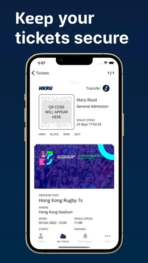 When Hong Kong Rugby Union release the match tickets you will find your tickets in the ‘My Tickets’ section of the App. To help keep your tickets safe and secure, the QR code for each ticket will only appear around 48 hours before gates open.