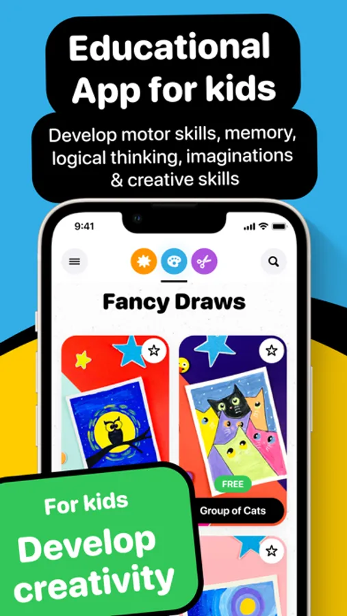 Our illustrations are intended for children from 2 years old. The pictures are bright, easy learning and challenging. We mainly focused on the development of children, so there are no strict rules on how to draw. Based on the video instruction child has the opportunity to implement the task on his own. He just need to watch a short video in each step and repeat. Additionally, all steps are followed by a detailed description. In each task there is also a progress bar, so the child will always have I an understanding, how much of the task he has already completed, and how much is left.