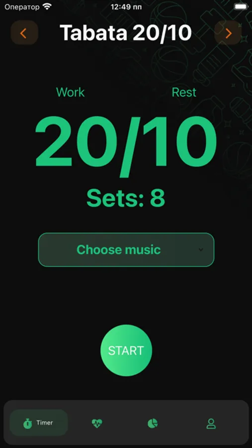 Workout timer 20/10 and 45/15 seconds stopwatch - are the most effective exercise timer scheme and you can find them in this fit app. If 20 seconds of work is not enough for you - choose the 45/15 interval timer. Our HIIT timer also includes simple tracks for training so you can orient on music temp and understand if it is work or rest period. You could also start Tabata timer without any exercise from our fit app and do it on your mind.
