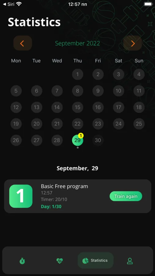 All finished Tabatas will be saved in your personal Training tracker. You can always analyze your training log and do specific training again. If you feel the power to do 2 or 3 or even more Tabata per one training - statistics will help you to understand where you stopped last time.