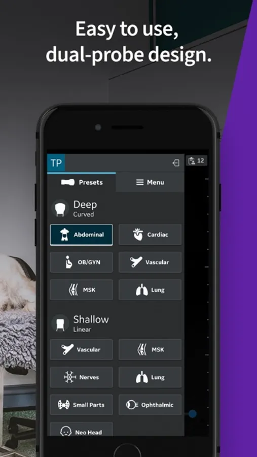 Without a cord to get in the way, Vscan Air VET app users are given quick access to scanning capabilities, with user-friendly controls and functionality. Quickly access presets and select those most closely aligned to conduct exams for various animal species, including canines, felines, equines, bovines, ovines, porcines, caprines, and even exotic animals like small mammals, reptiles, and birds.