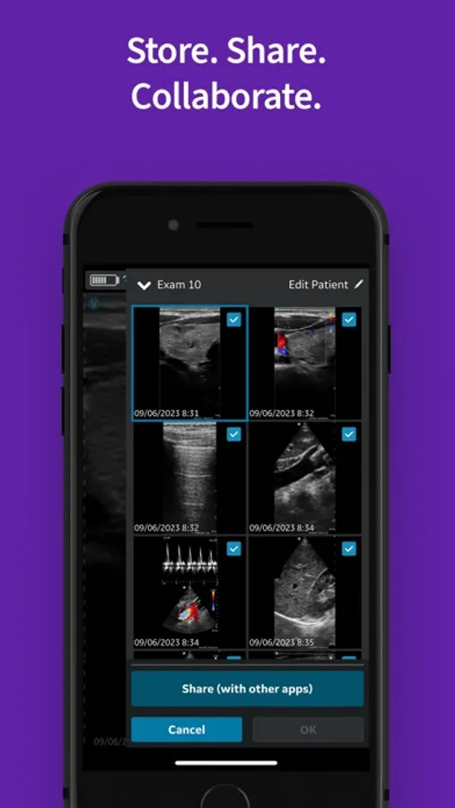 The Vscan Air app also offers easy access to image storage and sharing capabilities. Easily export anonymous JPG/MPG files with other apps, colleagues, and even pet parents, all without the need for a cloud service.