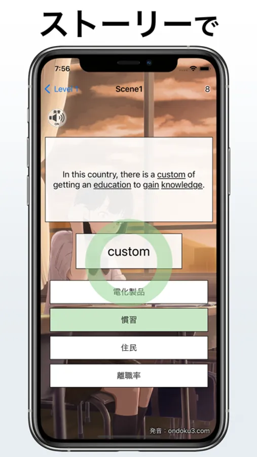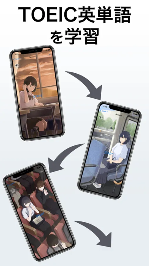・1つのイラストあたり3つの英文が表示されるので、1イラストあたり12個のTOEIC英単語を学習できます。
