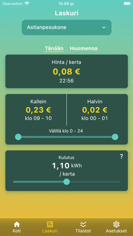 Katso kuinka paljon kWh maksaa nyt, illalla ja huomenna. Tämän perusteella voit arvioida, paljon sähkönkulutuksesi maksaa minäkin hetkenä.