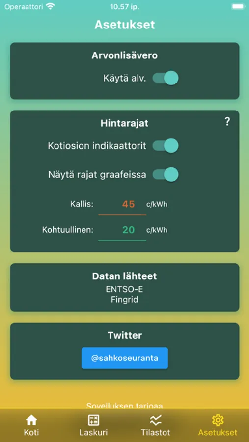 Sovellus sähkön hinnan seuraamiseen. Sähköseurannan tarkoituksena on auttaa löytämään hetket, jolloin sähkön hinta on matalimmillaan.