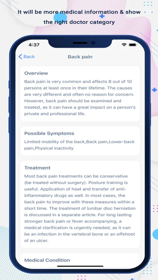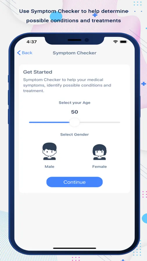 Symptom Checker app to help determine a list of possible diseases based on the diagnosis engine. It will be more medical information and show the right doctor category.