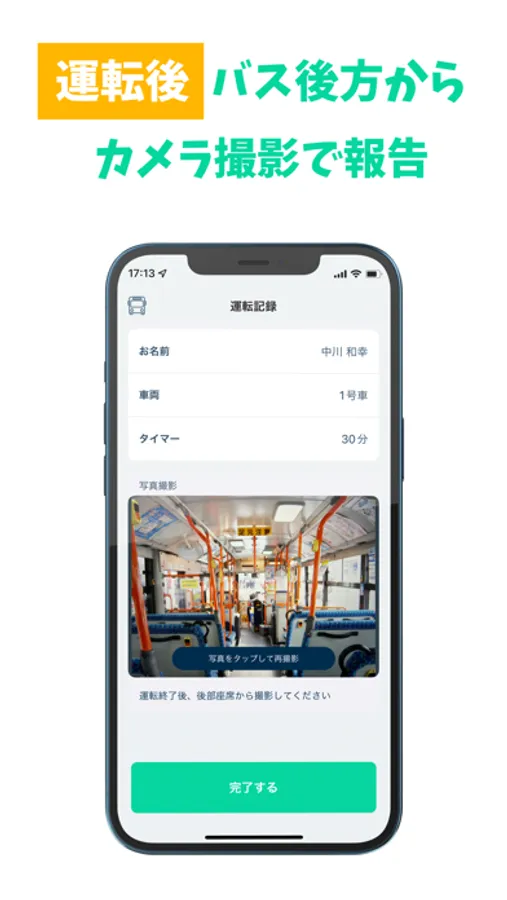 この「アラーム停止スイッチ」を、このアプリでは「バスの最後部からの写真を撮影するという行動」で