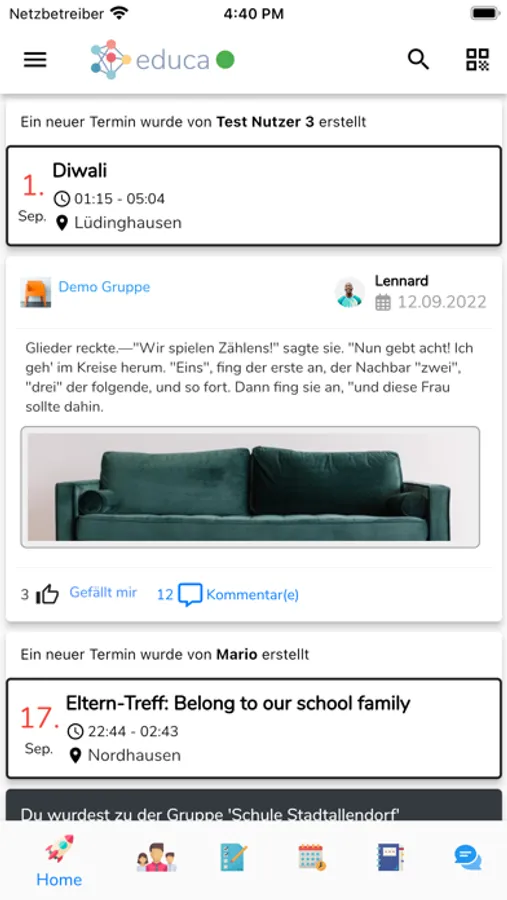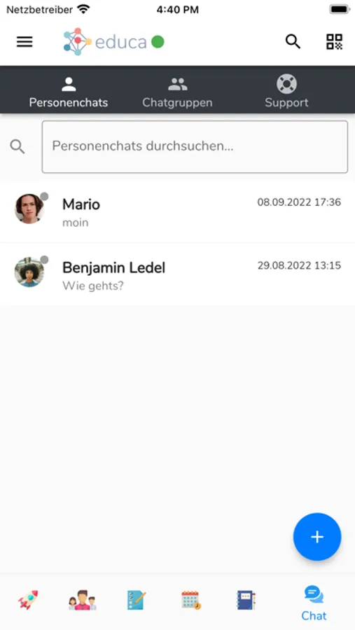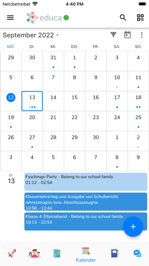 Ob Klassenstunde, Nachhilfeunterricht oder Nachmittagsprogramm – Termine bieten eine Basis für (digitale) Treffen und den termin-spezifischen Informationsaustausch: Protokolle und Dateien können verknüpft werden. Externe Teilnehmer können unkompliziert und sicher eingeladen werden. Schnittstellen zum Kalender von Outlook sind bereits integriert, weitere bauen wir gerne an (Webcal-Support).