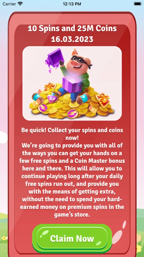 There are some player who don't know get spins and coins daily rewards. Use Spins for Coin Master app will update daily reward links for you receive spins and coins with one tap.