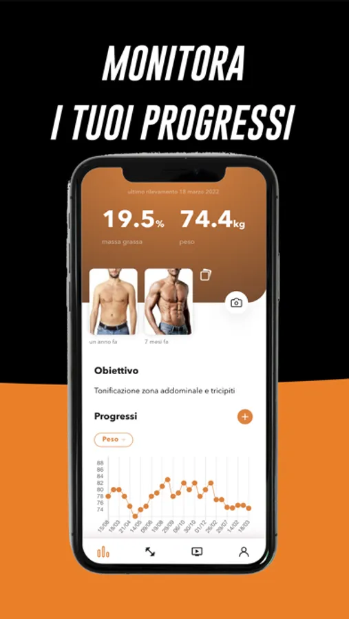 Avrai sempre sotto controllo la tua attività fisica: potrai visualizzare quali esercizi sono previsti nel tuo piano di allenamento, i tuoi progressi e come cambia il tuo fisico nel corso del tempo.