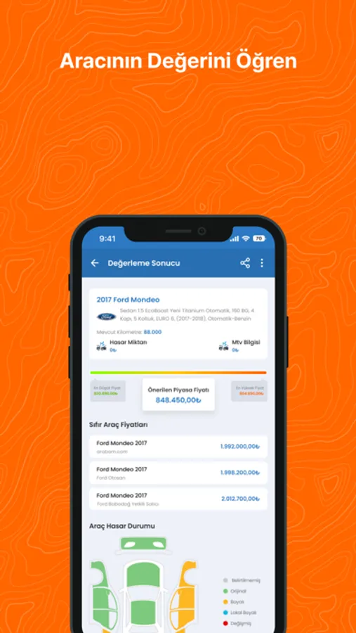 İkinci el araç değerleme hizmetimiz ile aracınızın güncel piyasa değeri cebinizde! Uygulamamız içerisinden aracınızı seçip, kilometre, hasar ve değişen/boyalı gibi bilgileri girerek saniyeler içerisinde ücretsiz olarak piyasa değerini öğrenebilirsiniz.