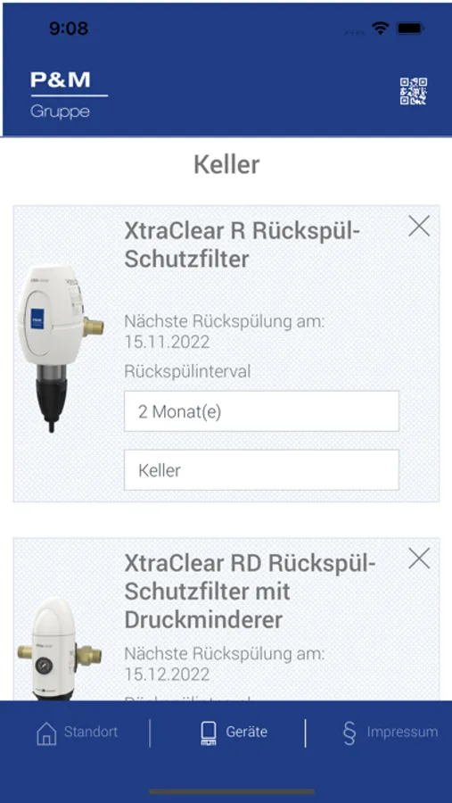 Hierzu kann für jeden XtraClear Filter ein Standort in der App angelegt werden. Anschließend können Sie den auf dem Gerät angebrachten QR-Code per Smartphone oder Tablet einscannen und so den Filter dem jeweiligen Standort zuweisen. Sie haben zusätzlich die Möglichkeit, zwischen mehreren Rückspülintervallen zu wählen.