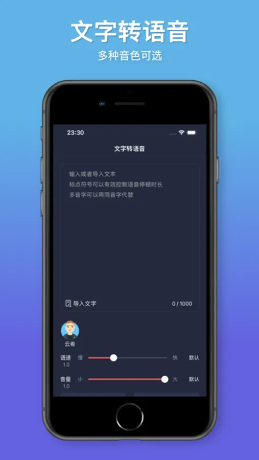 这是一款专业的文字转换配音APP,输入或者导入文字即可开始转换并保存语音,支持不同风格的主播发音角色,满足你不同场景下的需求。