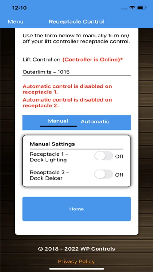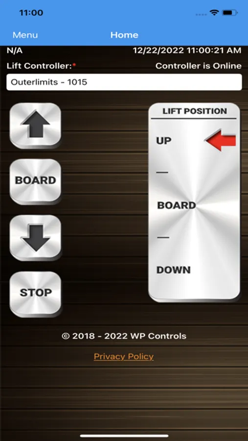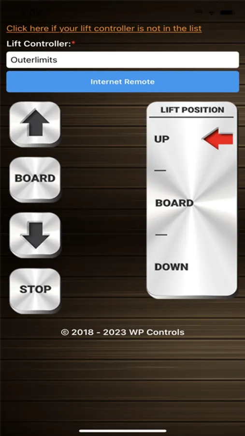 WP Controls Boat Lift Controller App. Enables owners of a WP Controls Boat Lift Controller to remotely control their boat lift with an internet connection. App has camera function, Receptacle remote control, Lift remote with UP, Down and Board positions, Lift position indicator, Bluetooth remote mode, and remote reboot option. The boat lift controller Serial Number must be registered with your account and the lift controller must be connected to a WIFI or ethernet network with internet connection. Bluetooth mode will work without internet connection but you must be within proximity of the lift controller.