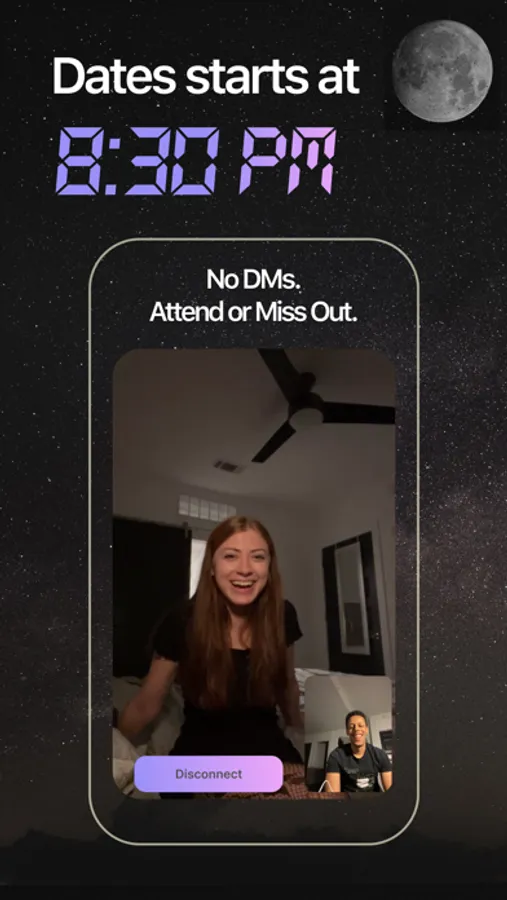 - There is NO text-based messaging. After two users match, the video date is scheduled at 8:30 PM local time. The users would need to attend the date to get to know each other!