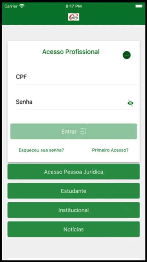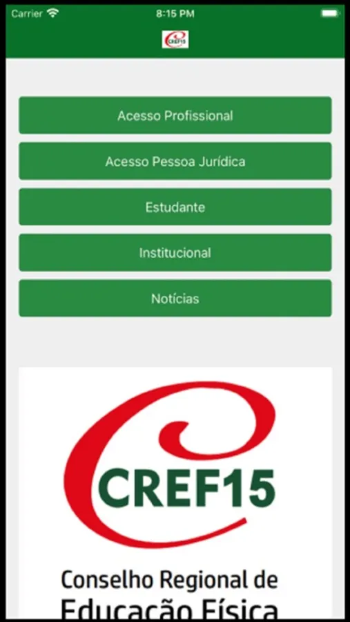 Aplicativo do CREF15/PI contendo notícias do conselho, a possibilidade de consultar e alterar dados cadastrais e realizar pagamento das anuidades do conselho.