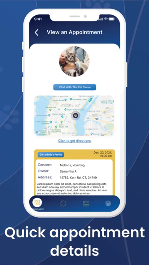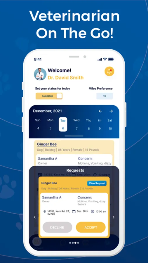 HomeVetNow is the ultimate solution for easily managing your doctor-on-demand veterinarian business. The in-app dashboard allows you to set your availability, effortlessly schedule appointments, and even control the geographic area where you provide your services. This flexibility will enable you to easily accommodate your client's needs and provide in-home veterinarian services. Finally, your clients will no longer have to endure the stress and inconvenience of traditional vet visits and can get veterinary care from the comfort of their homes or office.