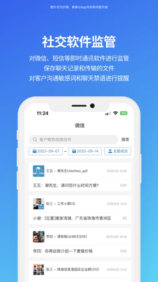 对短信、微信等社交软件进行监管和存档,保存聊天记录和传输的附件,进行信息备份和重要文件管理。同时,对聊天敏感词和禁语进行提示和预警。