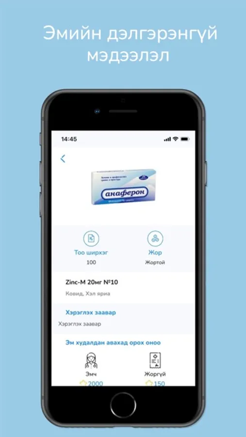 Энэхүү апп нь тухайн хэрэглэгч эмийн сангаас жорын цаас болон жорын цаасгүйгээр худалдан авалт хийхэд эмч болон эмийн санчид оноо орон тэр оноогоорооо зарцуулалт хийдэг эмийн бүтээгдэхүүн зардаг апп.