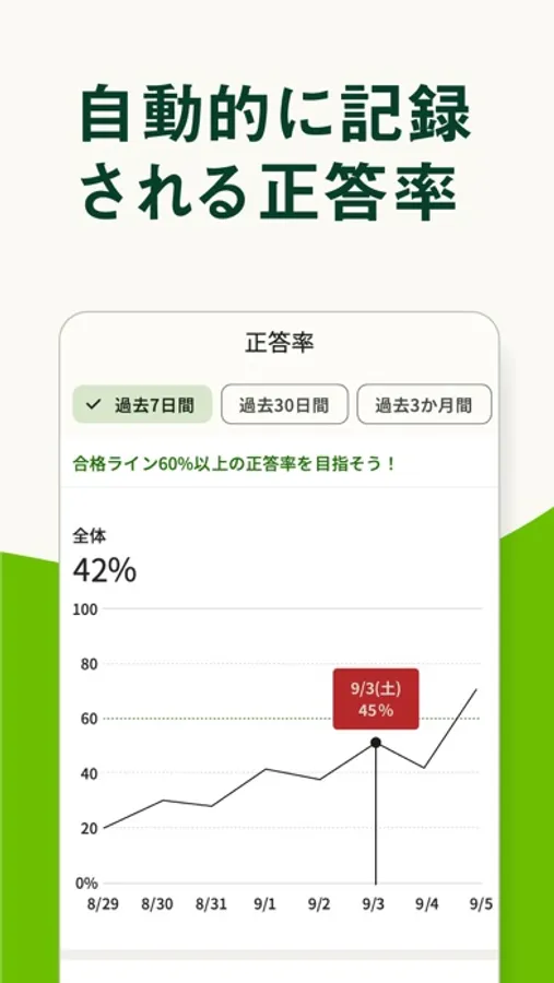 合格ラインに達しているかを確認できる正答率と、頑張りが可視化された回答数を確認して合格を目指そう!