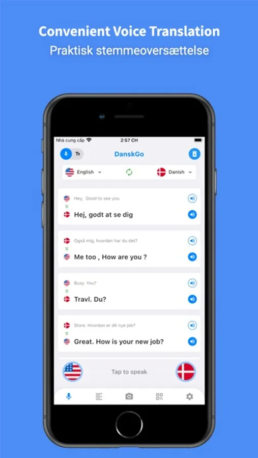 Hi ! DanskGo is the leading danish Translator with a lot of outstanding features such as accurate voice translator, translate any text in 45 languages to danish or danish to any language such as: English, Korean, German, Japanese, Vietnamese, Chinese, etc and extremely useful photo translating feature or learn danish more easily.