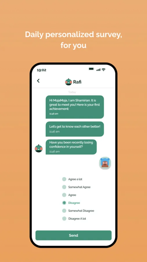 2. Set goals and complete daily check-ins with Rafi, our wellness companion. Rafi provides daily tips and helps you track progress in five main areas: overall well-being, sense of purpose, motivation, social relationships, and life satisfaction.